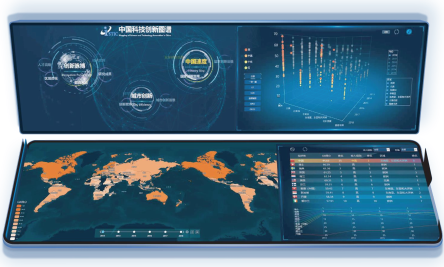 通过“基础一分析一决策”的叙事主线,充分利用大数据、地理信息、知识图谱、时空数据挖掘 技术,对各地区的科技创新数据,进行空间、时间、属性等多维度的可视化展示与场景交互探索, 述城市科技创新系统的运行情况评价以及特征、问题、趋势的发现与分析。