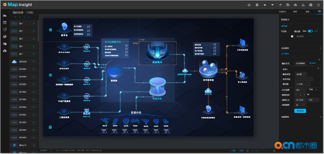oMapInsight是都市圈公司自主研发的可视化定制平台,可用于业务数据的大屏可视化及地图大屏可视化。作为一个专业的可视化定制平台,我们依据客户需求不断对oMapInsight进行升级和迭代。