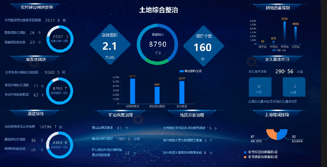 一键换数模式、一键换肤模式:简单选择即可一键更换大屏数据、配色风格。