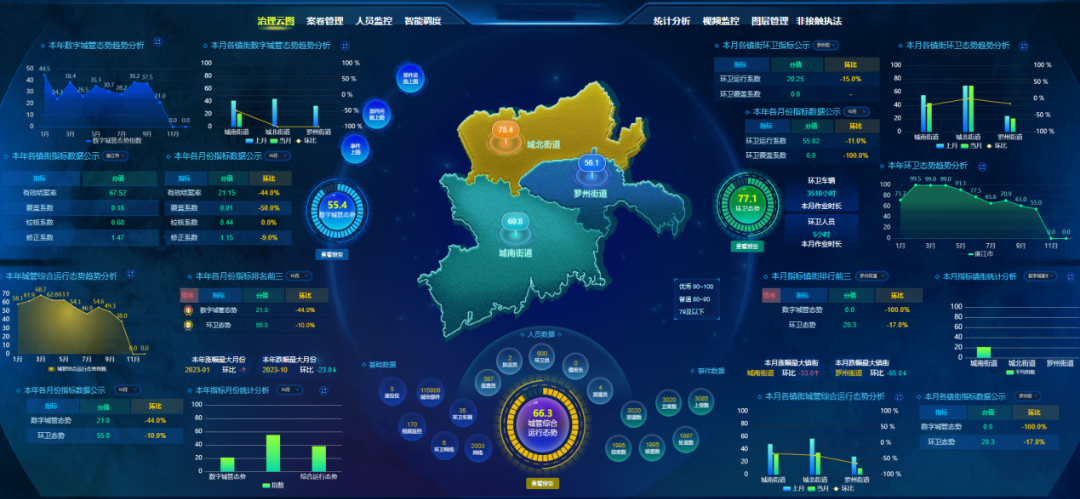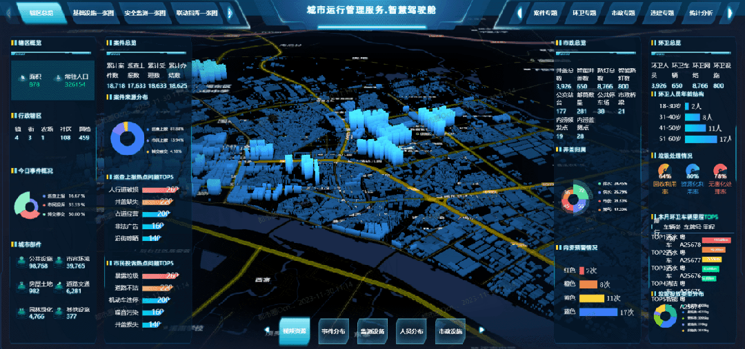 智慧驾驶舱包含辖区总览、基础设施一张图、安全监测一张图和联动指挥一张图四个主题模块,还包含案件专题、环卫专题、市政专题、违建专题、城市面貌专题等若干专题模块,既有对城市治理核心业务场景的实时再现,也有对行业监管事项的全面覆盖。